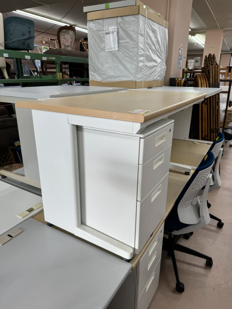 木製天板×スチール脚の洗練された一台。大容量の袖机付きで、デスク周りもスッキリ。